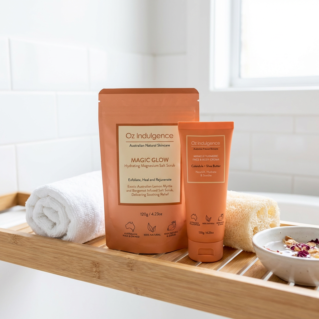 Begin with the Magic Glow Salt Scrub gently buffing away dryness to reveal silky-smooth skin, with an elegant fusion of native lemon myrtle and uplifting bergamot, finished with a whisper of peppermint — evoking the tranquillity of a luxury day spa.